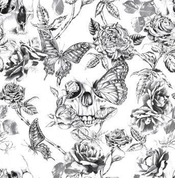 Luxusní vliesová tapeta v šedé barvě s motivem květin, motýlů a lebek malovaných tužkou na bílém podkladu.