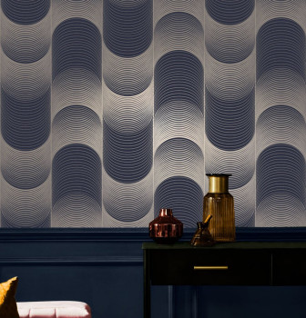 Vliesová tapeta se stříbrnými vlnkami na tmavě modrém podkladu vnese do interiéru luxus a noblesu.