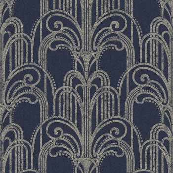 Luxusní tmavě modrá vliesová tapeta s šedými metalickými ornamenty ve stylu Art deco.