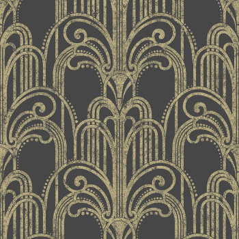 Luxusní černá vliesová tapeta se zlatými ornamenty ve stylu Art deco.