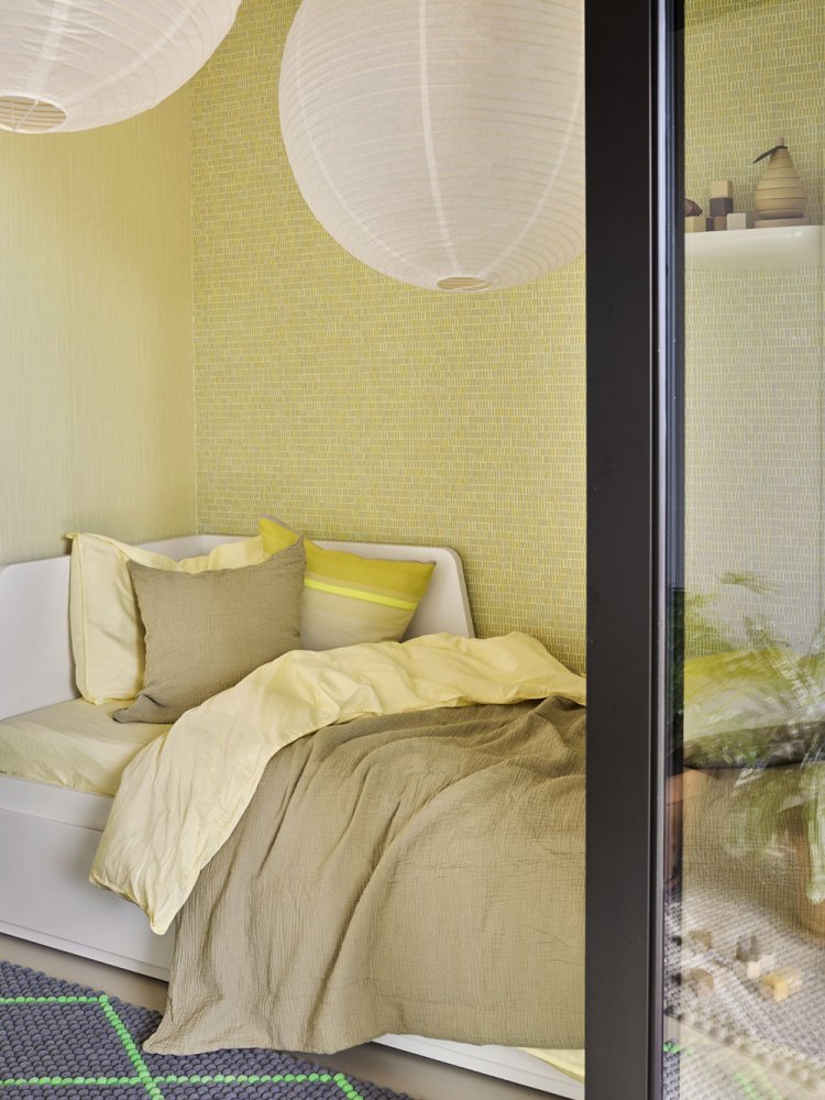 Jemně plastická, grafická vliesová tapeta v odstínech žluté a šedo-béžové, s vinylovým povrchem.