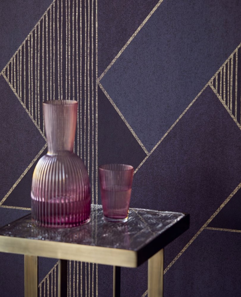 Vliesová tapeta. Geometrický design ve stylu Art Deco - linie zlatý pololesk, podklad tmavě modrá.