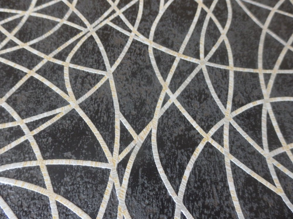 Výrazné nepravidelné zlato-stříbrné plastické linie dají interiéru styl a dokonale vymezí prostor. Strukturovaný šedo-černý podklad.