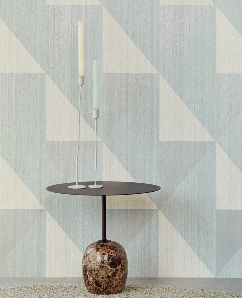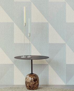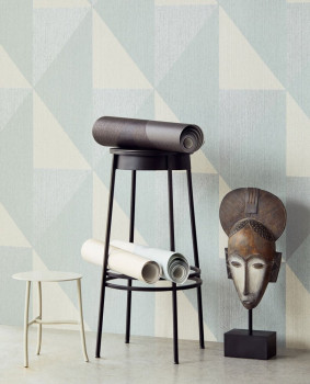 Vliesová tapeta. Velký geometrický vzor v odstínech modré, šedé a šedo-stříbrné.
