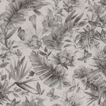 Luxusní květinová vliesová tapeta s vinylovým povrchem v pestrých barvách s metalickými odlesky. Motiv tropických květin a motýlů. Hrubá struktura.