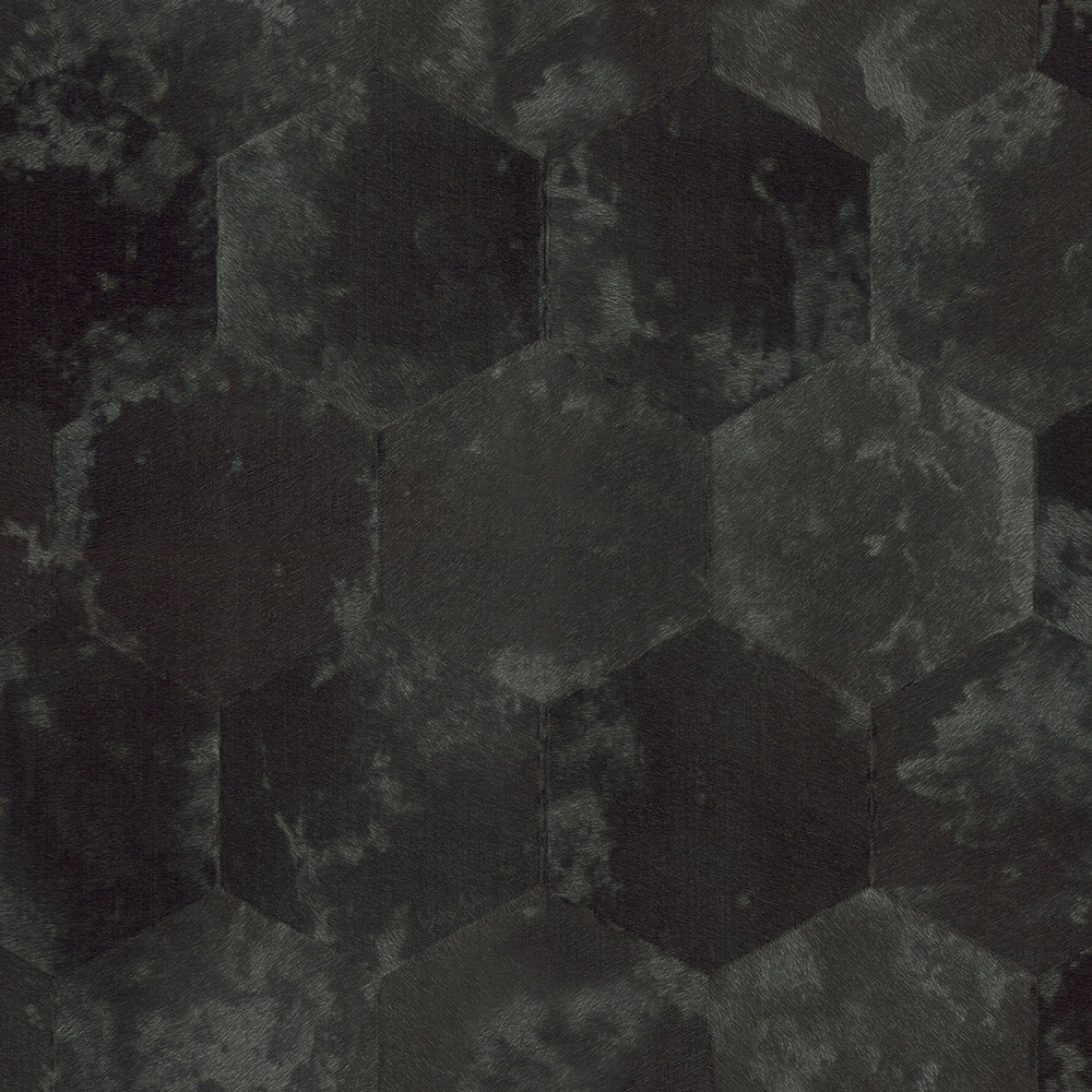 Luxusní vliesová tapeta s vinylovým povrchem v černé barvě s hrubou strukturou a geometrickým vzorem šestiúhelníků.