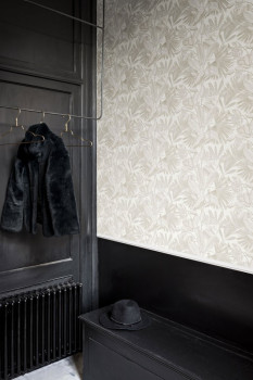Krémová vliesová tapeta na zeď, motiv listy a ptáci, látková textura.