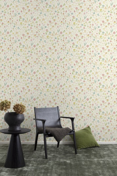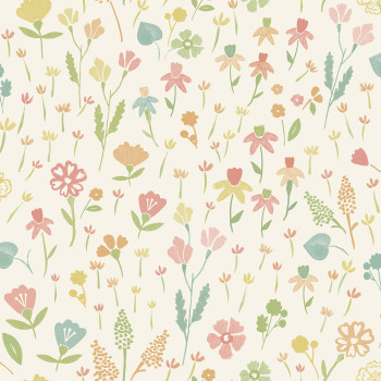 Krémová vliesová tapeta na zeď, květiny v odstínech zelené, tyrkysové, okrové a růžové. Tapeta má jemnou krupičkovou texturu.