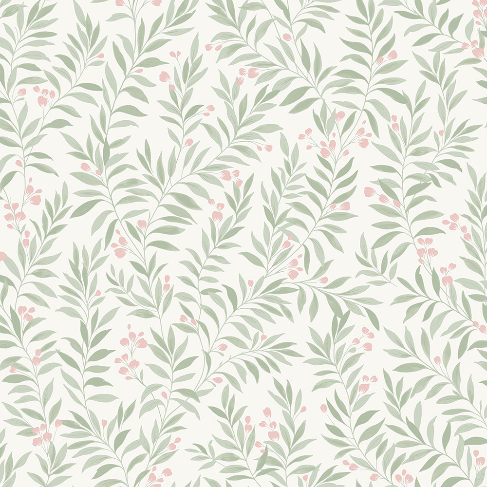Vliesová tapeta na zeď se zelenými listy a růžovými květy na krémovém podkladu. Tapeta je vhodná do ložnice, chodby nebo obývacího pokoje.