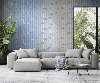Luxusní plastická stříbrná vliesová tapeta s vinylovým povrchem, proplétaný vzor, modré linie.