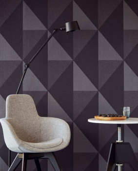 Vliesová tapeta. Velký geometrický vzor v odstínech černé a tmavě šedé, s jemným pololeskem.