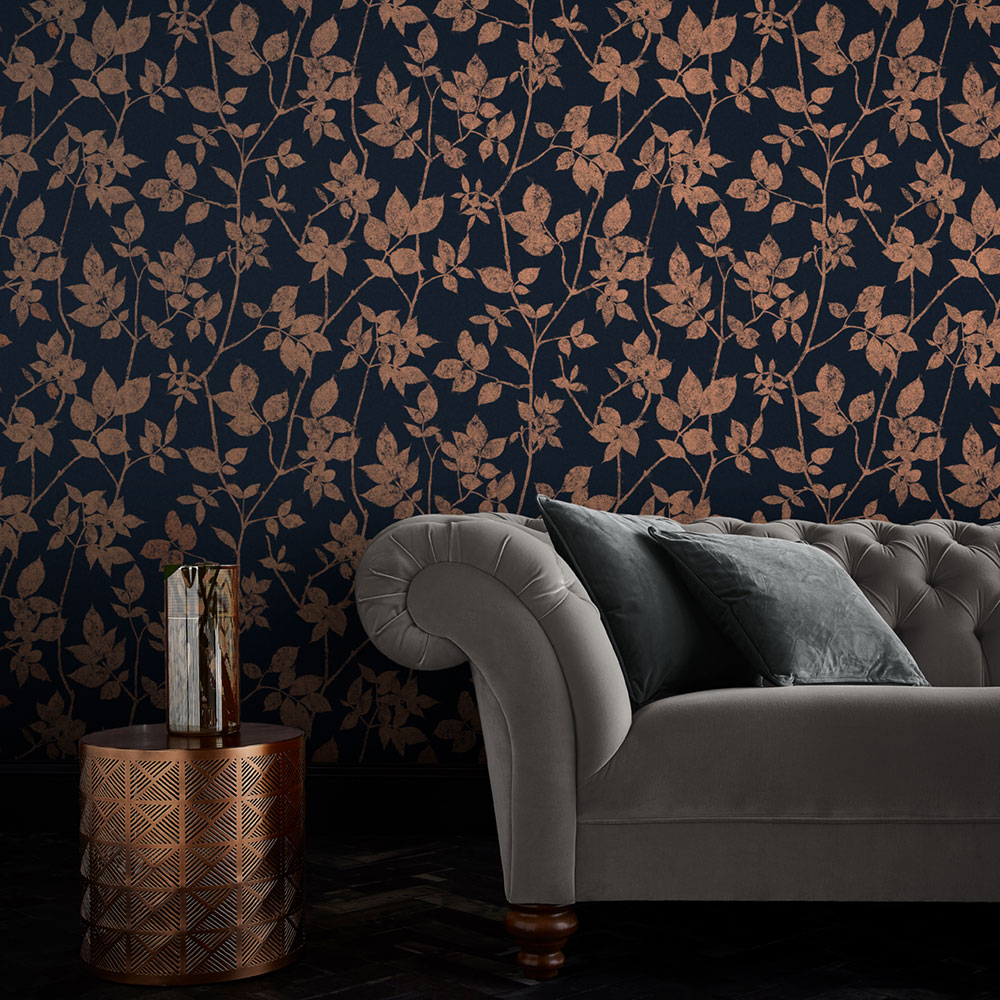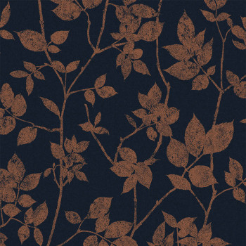 Vliesová tapeta s kvalitním papírovým povrchem - matný temně modrý podklad, bronzové obrysy větviček s listy.