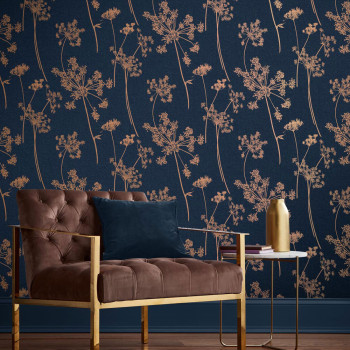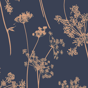 Vliesová tapeta s kvalitním papírovým povrchem - matný temně modrý podklad, metalické bronzové obrysy lučních květin, trávy.