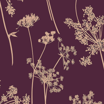 Vliesová tapeta s kvalitním papírovým povrchem - matný vínový podklad, metalické béžové luční květiny, trávy.