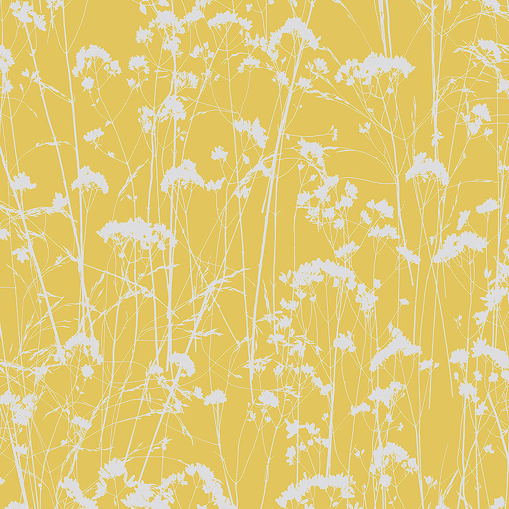 Vliesová tapeta s kvalitním papírovým povrchem -okrový podklad, obrysy stříbrných lučních květin, trávy.