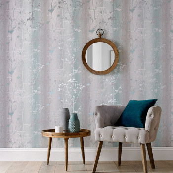 Vliesová tapeta s kvalitním papírovým povrchem - tyrkysovo-šedá s ombré efektem, stříbrné a metalické tyrkysové luční květiny.