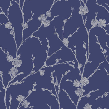 Vliesová tapeta s kvalitním papírovým povrchem - matný tmavě modrý podklad, stříbrné rozkvetlé větvičky třešní.