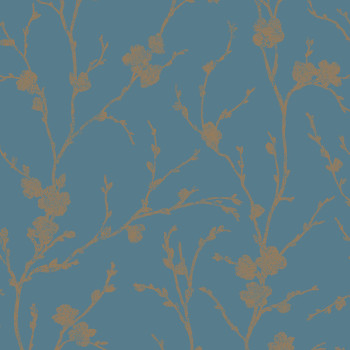 Vliesová tapeta s kvalitním papírovým povrchem - matný tyrkysový podklad, bronzové rozkvetlé větvičky třešní.