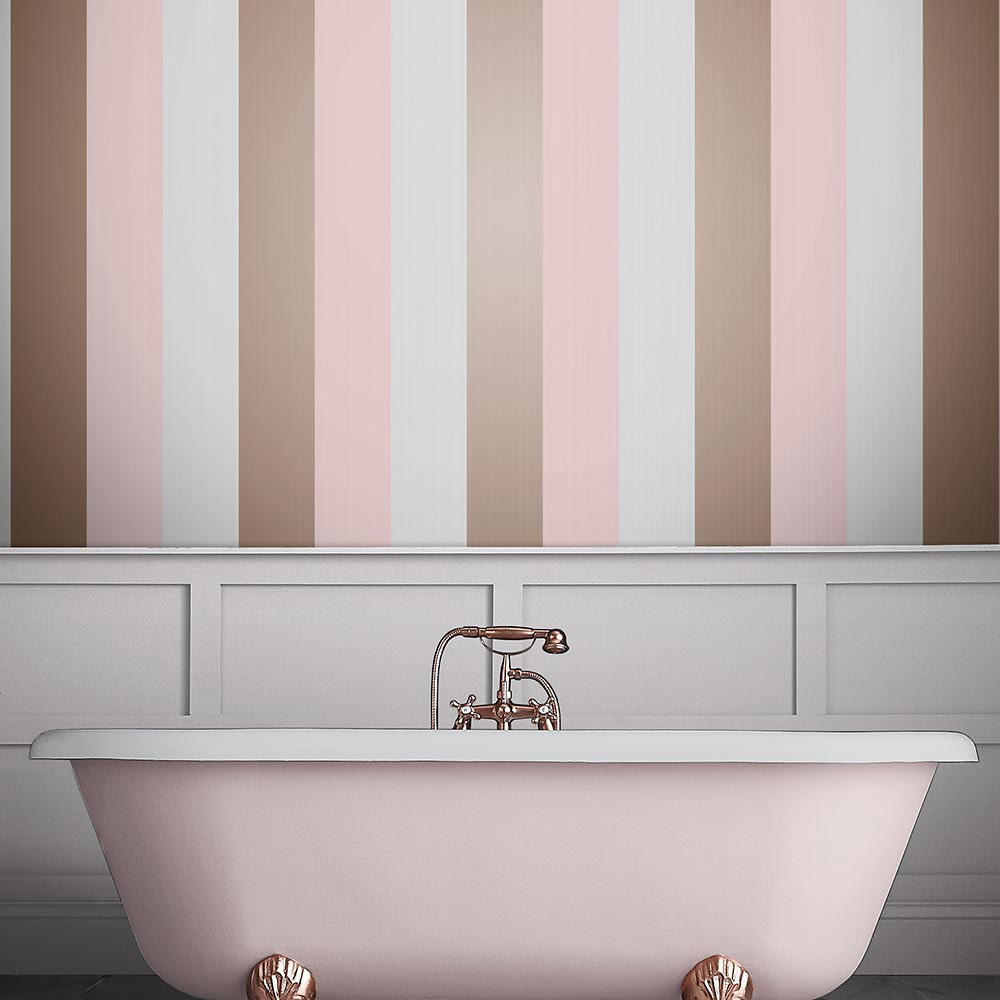 Hladká vliesová tapeta s papírovým povrchem - pruhy v odstínech růžové, šedé a metalické/růžové zlato. Tapetu lze lepit vodorovně i svisle.