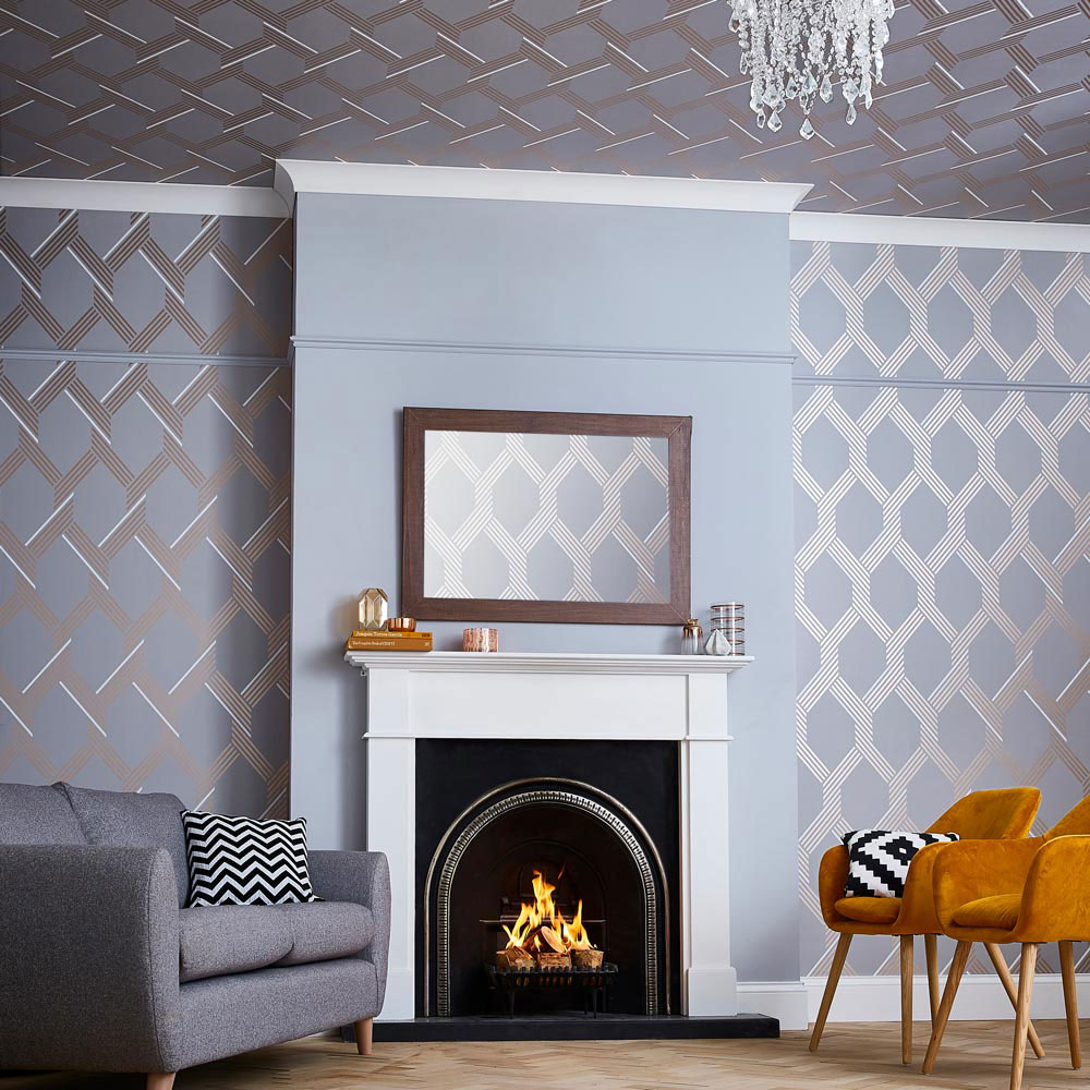 Vector, vytvořený z archivního designu výrobce Graham and Brown, je odvážný geometrický vzor s čistými, ostrými liniemi a přináší prvky symetrie. Vektor, což znamená množství mající směr i velikost, byl vytvořen v paletě barev, která odráží moderní město v různých denních dobách s odlesky moderní metalízy.