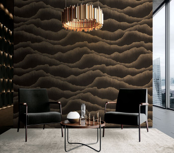 Luxusní vliesová tapeta na zeď - proužková textura s černo-zlatými vlnkami. Tapeta vhodná do obývacího pokoje nebo pracovny.