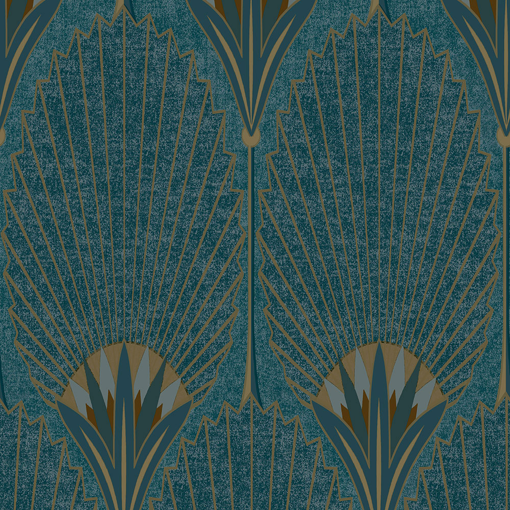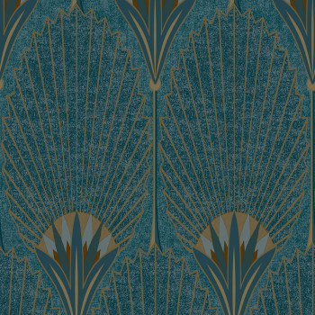Vliesová tapeta se zlatými geometrickými vzory na strukturovaném tyrkysovém podkladu vnese do interiéru příjemnou atmosféru luxusu.