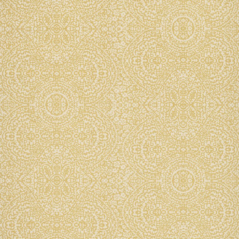 Zlato-žluté ornamentální vzory na krémové vliesové tapetě s jemnou látkovou strukturou.