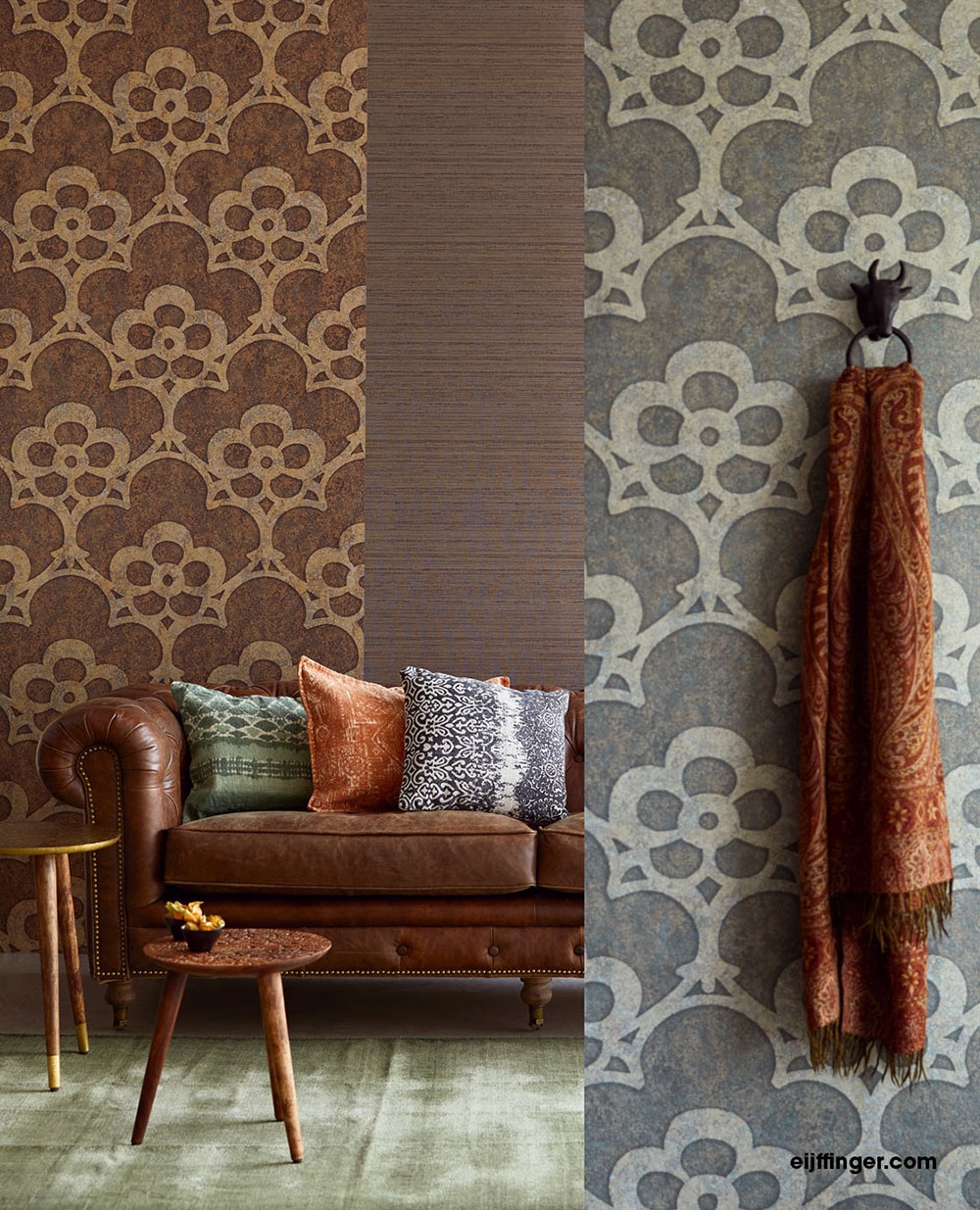 Sundari: sbírka s nádhernými vinylovými designy s různou texturou. Perský koberec se starobylými dekorativními ozdobami, rafinované řezbářství, indický botanický design s granátovými jablky a ohromným kašmírovým motivem, nakreslený v oprýskanýchlinkách stříbra a zlata. Vzor zlatého lupenu listu na plátně s jemnou horizontální texturou tkané trávy. Od jemné béžové až po krémově bílou a šafránovou, pálenou červenou, seladonovou, modrý smaragd a tmavě černou. Bohatý výběr tapet v různých provedeníchoprýskaných stěn ke vzorům rybí kosti, lemovaného papíru, elegantního kovu, kašmíru a batiky.