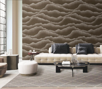 Luxusní vliesová tapeta na zeď - proužková textura s hnědo-zlatými vlnkami. Tapeta vhodná do obývacího pokoje nebo pracovny.