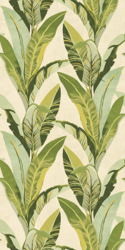 Velké listy v zelených odstínech na světle béžovém vliesovém podkladu. Tapeta má návazný vzor, pro větší šířku stačí přikoupit další kus.