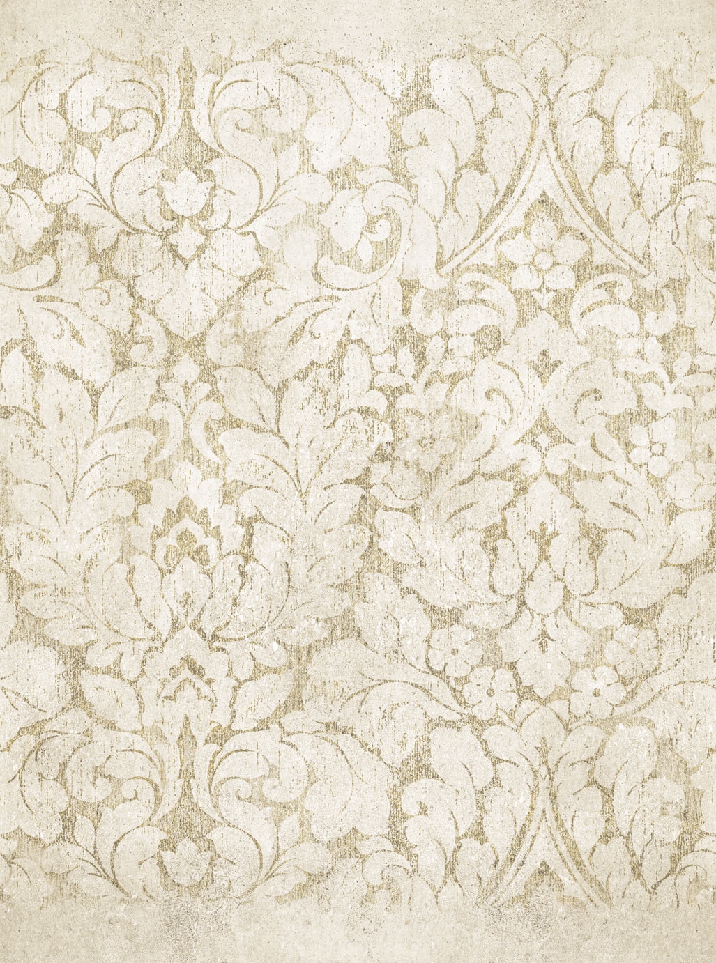 Velké ornamentální vzory na béžové vliesové obrazové tapetě.