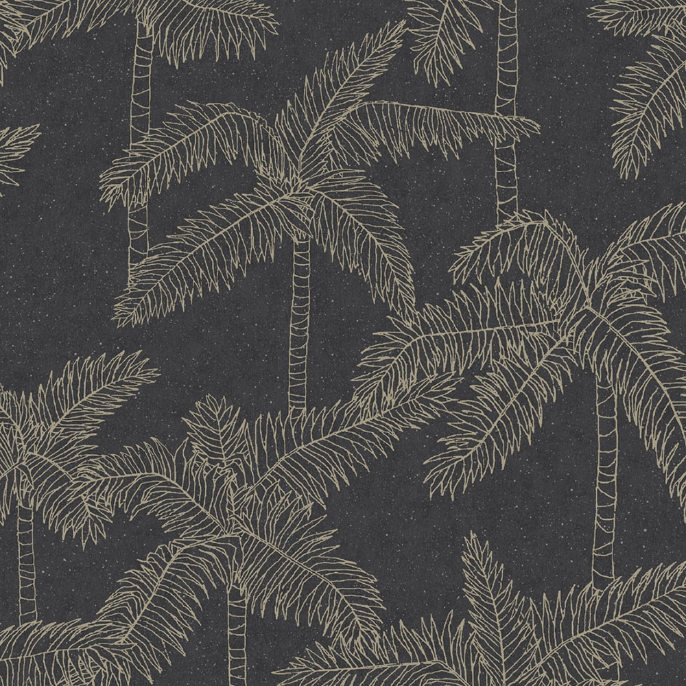 Rostlinné motivy představují moderní trend v oblasti bydlení. Zlaté obrysy palem na černéjemně žíhané vliesové tapetě na zeď.