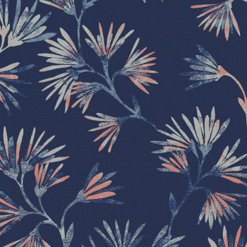 Netradiční květinový vzor na temně modrém podkladu. Květy v šedých a metalických růžových odstínech. Kovové odlesky vnesou do interiéru luxus a eleganci.