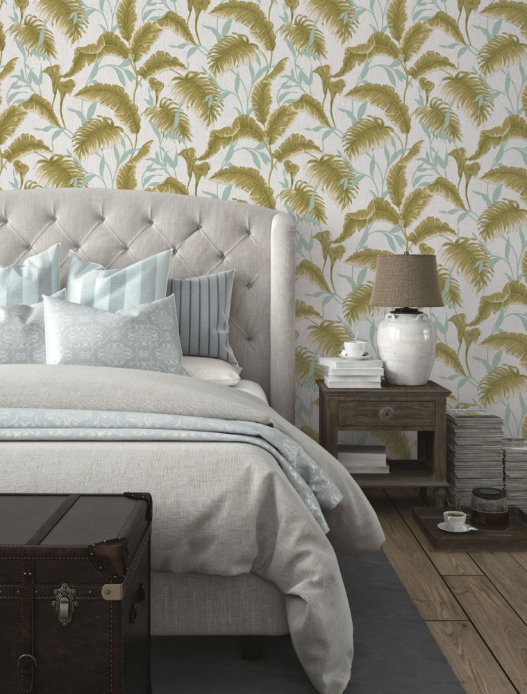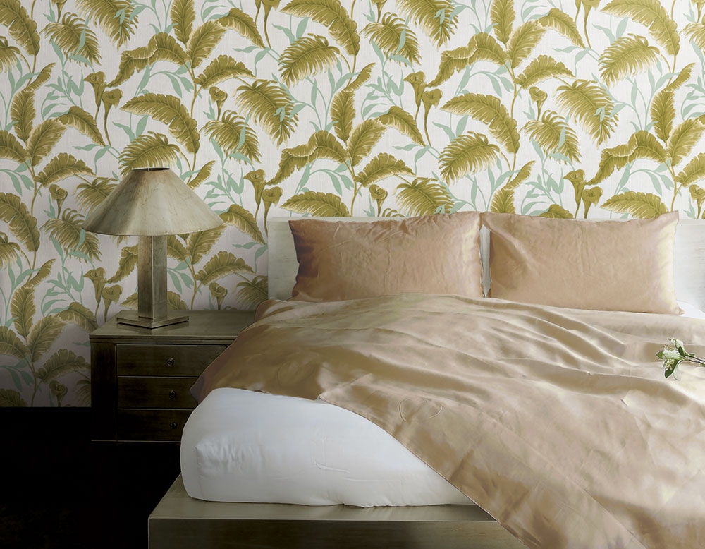 Vliesová tapeta na zeď s látkovou texturou. Podklad perlová, listy v odstínech zelené a světle béžové.