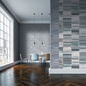 Role šíře 0,7m. Žíhaný design, hrubá textilní struktura, podklad šedo-hnědo-béžový, výrazná struktura vláken se stříbřitým odleskem.