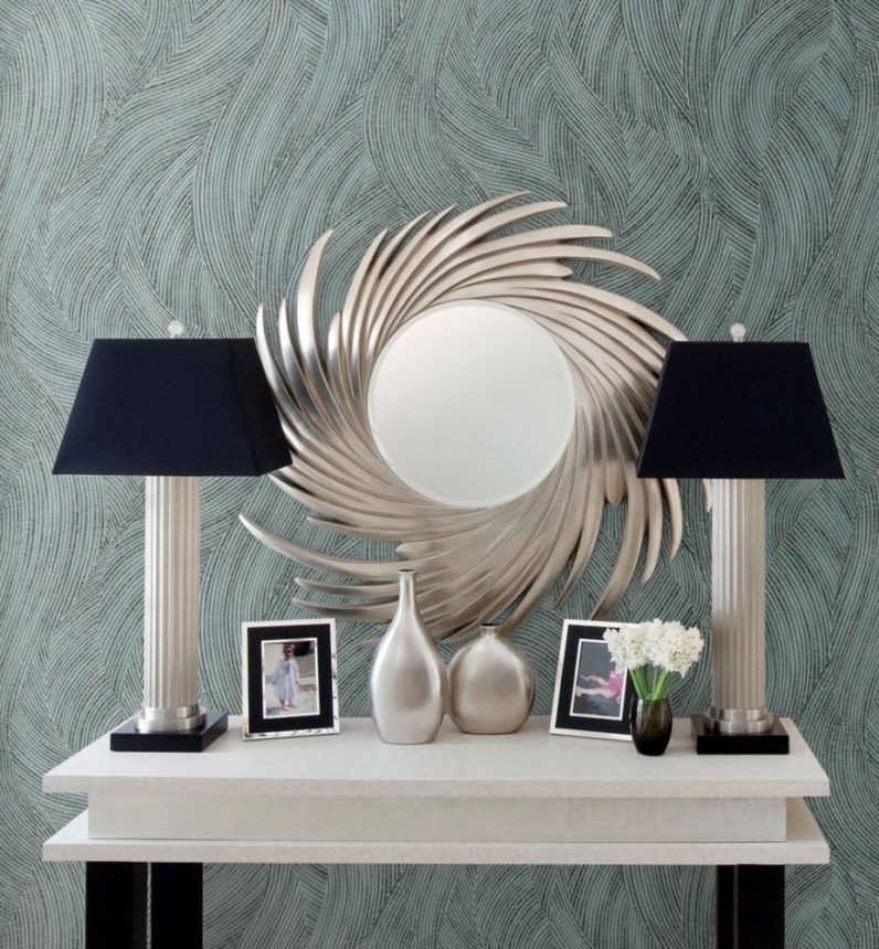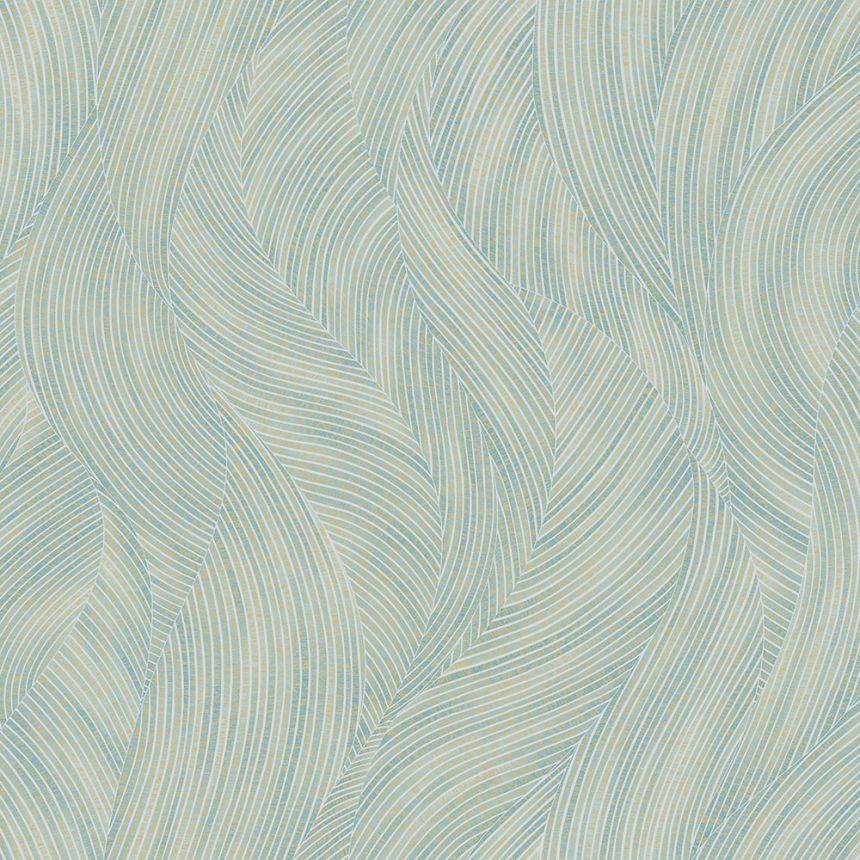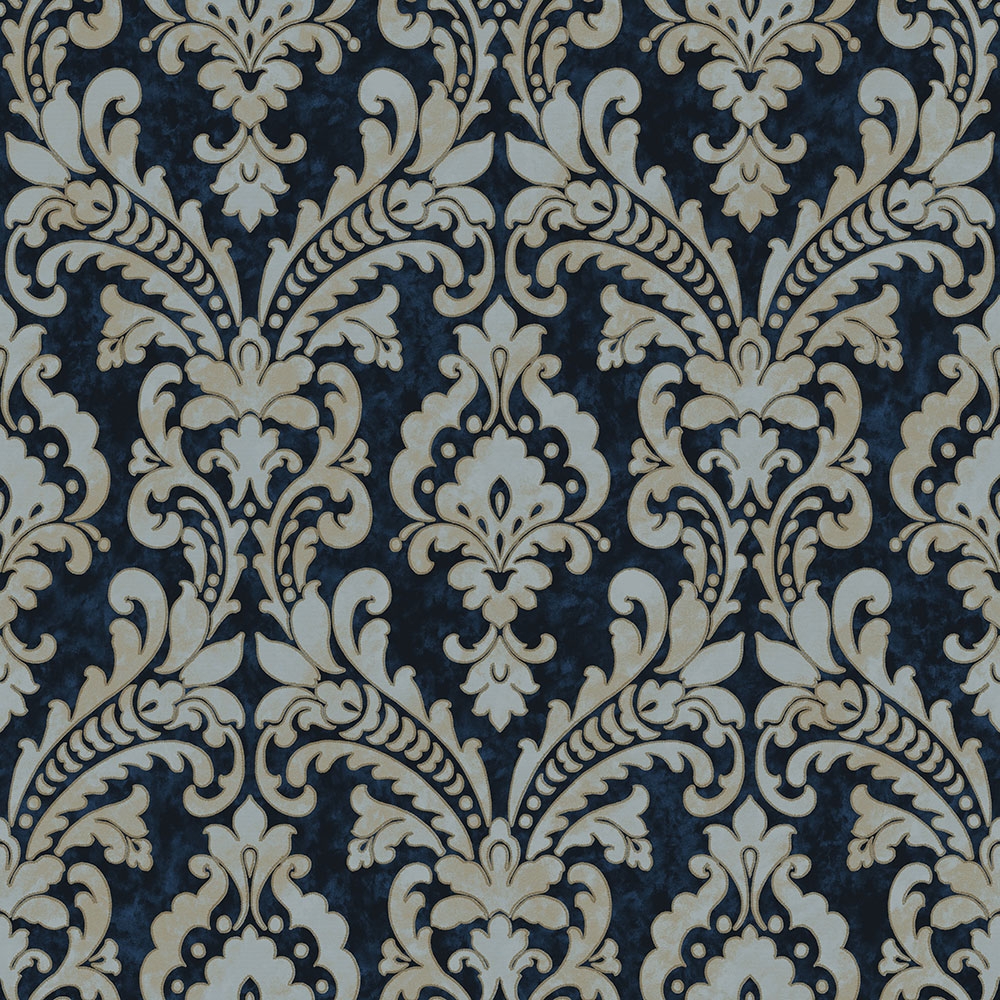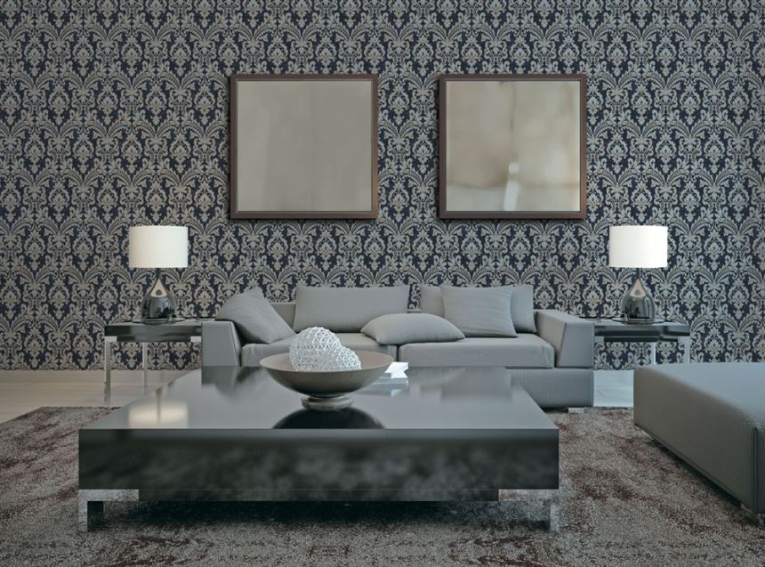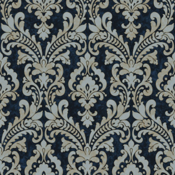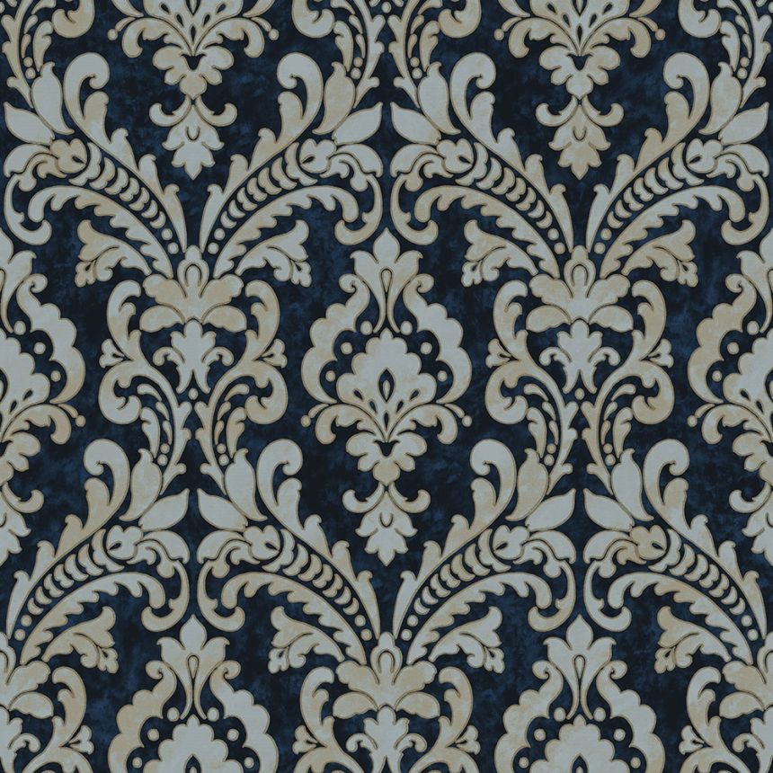 Vliesová tapeta na zeď. Vzor v odstínech pololesklé metalické zlato-béžové a stříbrné, podklad pololesklý tmavě modrý.