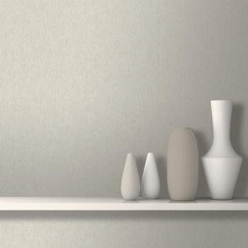 Elegantní žíhaná omyvatelná tapeta s jemnou texturou v odstínech šedo-béžové, podle dopadu světla měnící se stříbřitý lesk.