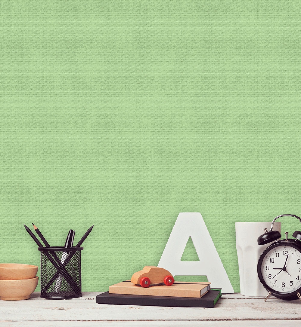 Decentní vliesová tapeta s jemnou látkovou texturou, odstín hráškově zelený. Snadno kombinujte se souvisejícími vzory.