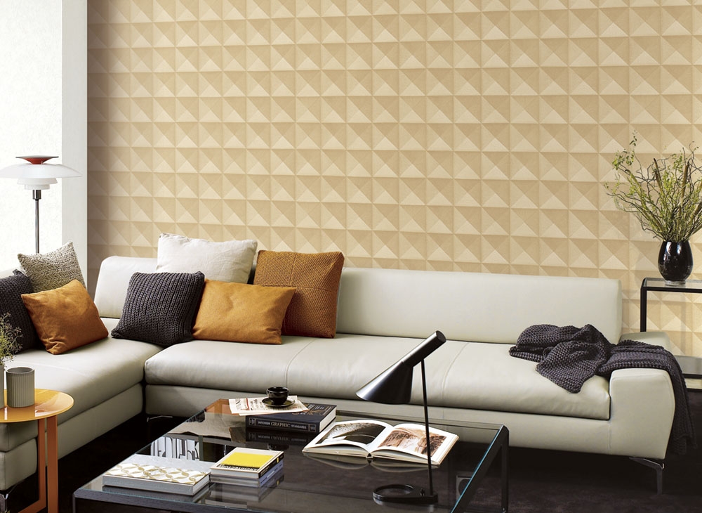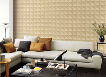 Luxusní efektní metalická zlato-hnědo-béžová tapeta s geometrickým vzorem. Odstíny se mění podle dopadu světla.