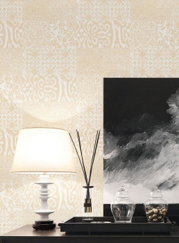 Vliesová tapeta na zeď. Podklad perlová metalická, plastický vzor metalická béžově-zlatá.