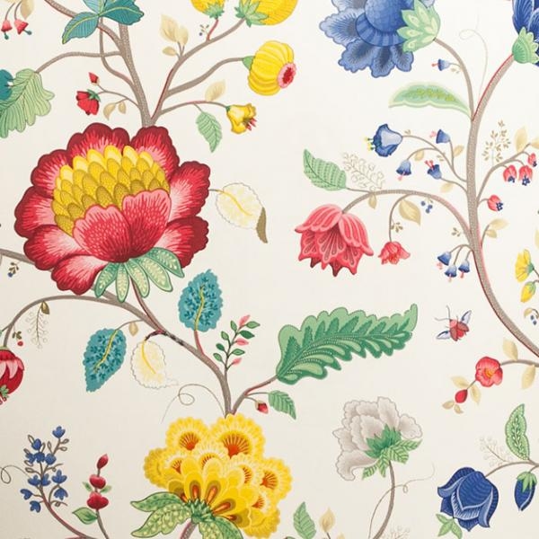 Pestrý květinový vzor na bílé vliesové tapetě.