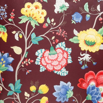 Pestrý květinový vzor na vínové vliesové tapetě.