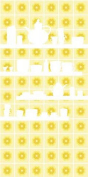 Žlutá vliesová obrazová tapeta na zeď, kuchyňské motivy.