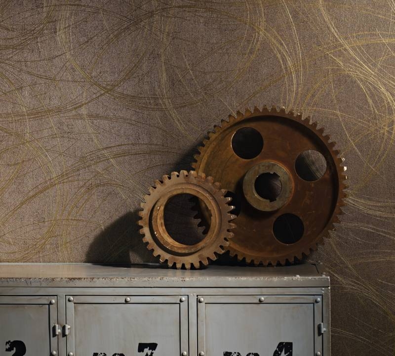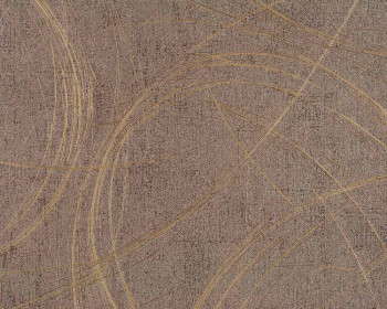 Škrábaný bronzovo-zlatý vzor na hnědé vliesové tapetě.