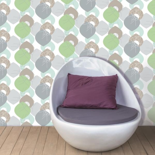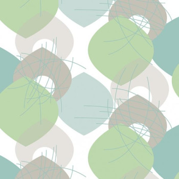 Vzory v šedé, tyrkysové a zelené barvě na bílé vliesové tapetě.