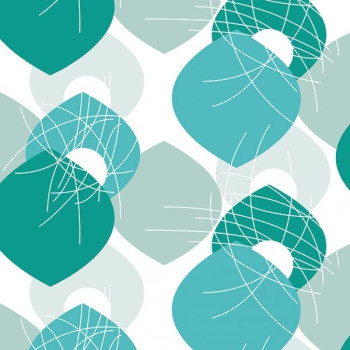Tyrkysové a zelené vzory na bílé vliesové tapetě.