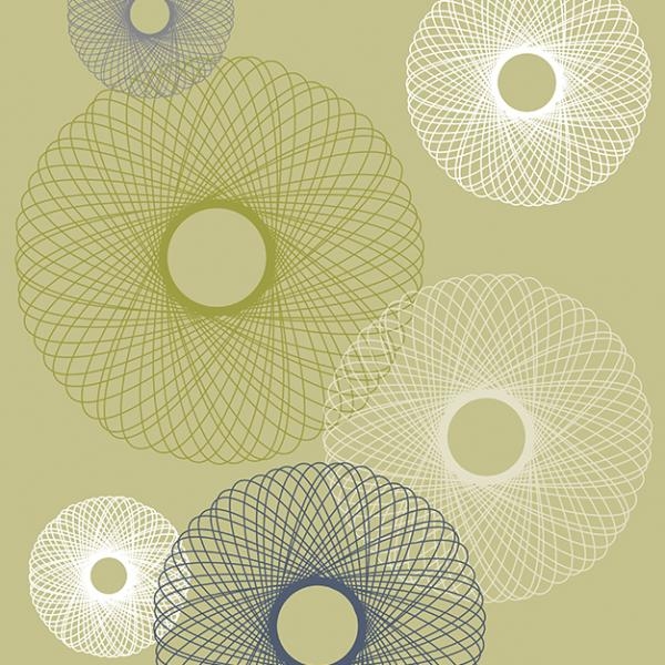 Spirály v zelené, modré, šedé a bílé barvě na zelené vliesové tapetě.
