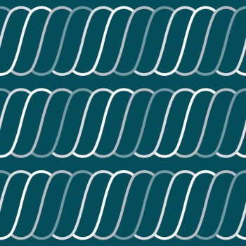 Geometrický vzor v tyrkysové, bílé a šedé barvě na tmavě modré vliesové tapetě.