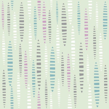Geometrické vzory ve fialové, tyrkysové a šedé na zelené vliesové tapetě.