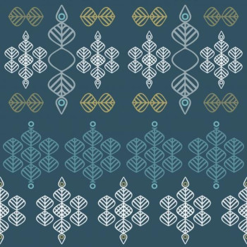 Bílý, zelený a modrý vzor na tmavě modré vliesové tapetě.
